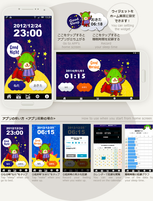 I designed and drew the illustration for this sleep management APP ”GoodSleep”. This App supports only a smartphone and a tablet of Android.When I arranged this character, I got inspiration from Ursa Major of the Big Dipper. After that, this character is developed as a picture book and some goods.