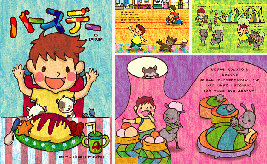 絵本『バースデー』制作。個人T様からのご依頼で甥っ子を主人公にした世界に1つだけの絵本をプレゼントしたいとの要望で、ストーリー・絵ともに制作。印刷は別注で製本したものを納品させていただきました。