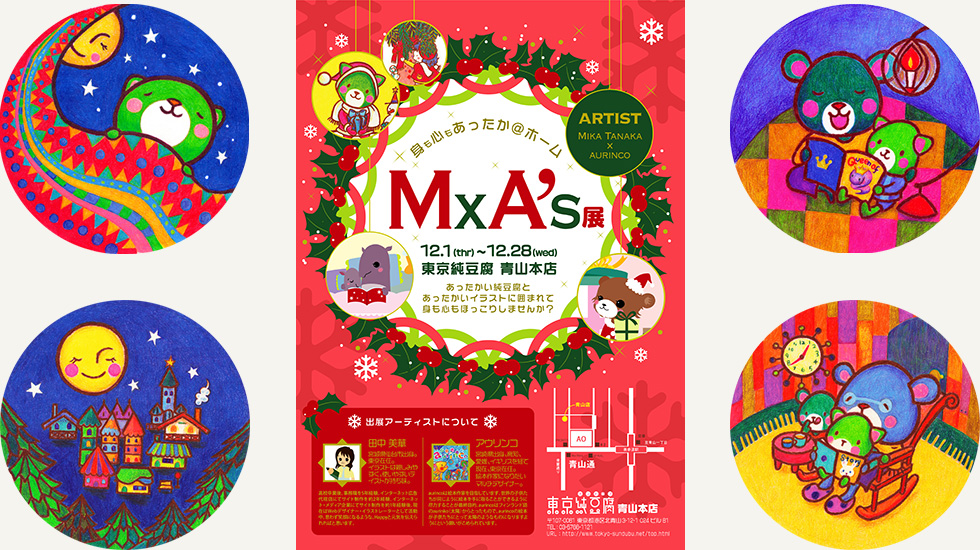 東京純豆腐青山本店でイラストの展示・販売をさせていただきました。イラストレーターの田中美華さんとの二人展です。時期がクリスマスシーズンだったこともあり、展示にはクリスマスを感じさせるディスプレイもさせていただきました。