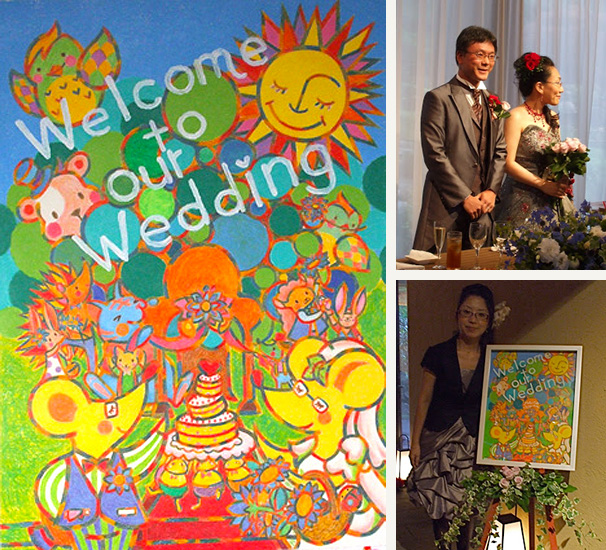ウェルカム・ボード制作/T様自身の結婚式用ウェルカム・ボードを制作させていただきました。新郎新婦を動物にしてほしい、森の中で結婚式を挙げるような雰囲気で描いてほしいとのご要望に応じ、いろいろな動物が集う結婚式を描きました。大きさはB3。すべてクーピーと色鉛筆をつかった手描きである。