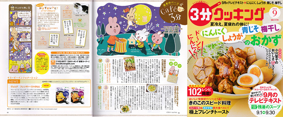 | Coment | : | 『3分クッキング』9月号の読者ページのイラストと4コマ漫画を担当させて頂きました。全国書店・amazonにてご購入いただけます。 |