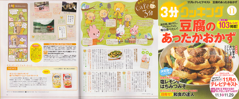 | Coment | : | 『3分クッキング』11月号の読者ページのイラストと4コマ漫画を担当させて頂きました。全国書店・amazonにてご購入いただけます。 |
