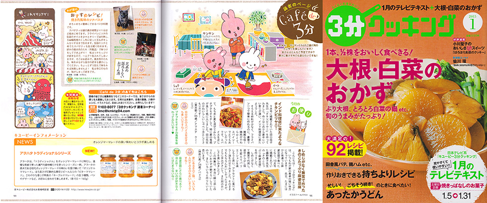 | Coment | : | 『3分クッキング』1月号の読者ページのイラストと4コマ漫画を担当させて頂きました。全国書店・amazonにてご購入いただけます。 |